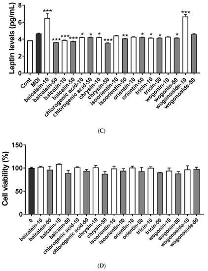 UPLC analysis showed that BS21 contained chlorogenic acid, orientin, baicalin, wogonoside, baicalein, tricin, wogonin, and chrysin (Figure 4 and Table 1). Groups of cells were treated with one of the nine compounds at concentrations of 10 and 50 μg/mL, and all compounds significantly reduced adipocyte differentiation and leptin levels except for wogonoside (Figure 5A–C). In particular, baicalein and baicalin at 10 μg/mL inhibited adipocyte differentiation by 50% compared with the differentiated MDI cells. These compounds did not affect cell viability at all concentrations tested (Figure 5D).