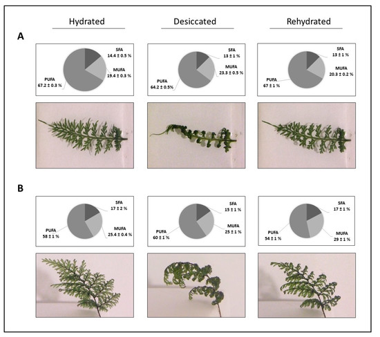 Fatty acid composition (%) and representative images of hydrated, desiccated and rehydrated fronds of two contrasting desiccation-tolerant filmy ferns subjected to a desiccation–rehydration cycle. (A) Hymenophyllum caudiculatum, less desiccation tolerant, and (B) Hymenophyllum plicatum, more desiccation tolerant. The corresponding values represent the mean of two biological replicates (± SE). Fatty acids nomenclature: Polyunsaturated (PUFA), monounsaturated (MUFA) and saturated (SFA).