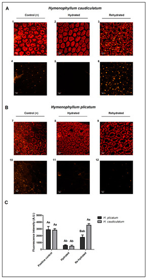 The integrity of the cell membrane was visualized by staining tissue with propidium iodide (PI), a fluorescent nucleic acid dye that enters only damaged cell membranes, producing an orange fluorescence [23]. At the full hydration condition, fronds of both species showed low fluorescence signals and low staining of the nucleus, indicating no damaged membranes in fully hydrated fronds (Figure 2, panels A, 2 and 5 and panels B, 8 and 11). However, at the rehydrated state, only the fronds of H. caudiculatum exhibited a high number of cells, with an increased orange fluorescence signal, particularly staining coming from the nucleus (Figure 2, panels A3 and panels A6), indicating that PI was able to enter the cell through damaged membranes caused by the desiccation–rehydration cycle.