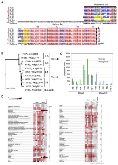 Earlier work on plant histones have demonstrated that plant H2B proteins are less conserved among all other core histone proteins [28,29]. The construction of phylogenetic trees revealed that HTB variants tend to cluster according to species. Thus, the N-terminal tails of HTB variants are more conserved within species than between species [16,30]. Alignment of the amino acid sequences of the Arabidopsis HTB variants shows that while the C-terminus is highly conserved (except for HTB8, At1g08170), most differences occur in the N-terminal region ([15,31], see also Figure 1A). Based on a phylogenetic tree (Figure 1B), HTB variants can be divided into three classes. Class I contains HTB1(At1g07790), HTB2 (At5g22880), HTB3 (At2g28720), HTB4 (At5g59910), HTB9 (At3g45980), and HTB11 (At3g46030) and class II HTB5 (At2g37470), HTB6 (At3g53650), HTB7 (At3g09480), and HTB10 (At5g02570). Class I variants can be further divided into class I-A (H2B4, 9, and 11) and class I-B (HTB1, 2, and 3) and class II into class II-A (HTB7 and 10) and class II-B (HTB5 and 6). The third class (class III) contains a single variant, HTB8, which is highly divergent from other HTB proteins. It consists of an extended N-terminal region and has a calculated molecular mass of about 27 kDa, which is significantly higher than other HTBs ranging from 14 to 16.5 kDa. BLAST analysis of HTB8 amino acid sequence against the NCBI database revealed HTB8 orthologs with an extended N-terminus mostly within the eudicot clade of angiosperms and other clades, monocots, and magnoliids. They differ in the length of the N-terminal extension and their molecular weight ranges from ~19 kDa (e.g., Oryza brachyantha, H2B.L4-like) to ~32 kDa (e.g., Sorghum bicolor, H2B.4). Sequence alignment (supplementary Figure S1) followed by the construction of a phylogenetic tree (Figure S2) showed that HTB8-like variants within Brassicales are highly conserved along the protein sequence, including the N-terminal extension (Supplementary Figure S1A) and are clustered according to their lineages within Brassicaceae (Figure S2). Although similarity in protein sequence of the N-terminal extension decreases with increasing phylogenetic distance (Supplementary Figure S1B), HTB8 orthologs in other families were clustered according to their lineages within eudicots (Figure S2). Notably, as indicated previously [15], a conserved motif is identified within the N-terminal extension of HTB8 orthologs in angiosperms (Magnoliids, Monocots, and Eudicots clades) with the core sequence KVVxETVxVxV (Supplementary Figure S3). This conserved motif points to a common ancestor for HTB8-like proteins in angiosperms, and might be central in determining their function in regulating chromatin organization and dynamics. BLAST analysis of the HTB8 C-terminal portion (122-243) revealed high amino acid sequence similarity with H2B proteins ranging from viridiplantae to metazoan, pointing to functional and structural conservation of the histone fold domain among eukaryotes.