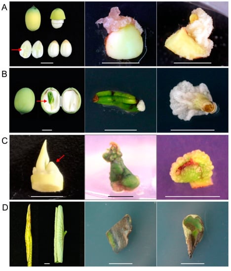 - Mostafa, H.H.A.; Wang, H.; Song, J.; Li, X. Effect of genotypes and explants on garlic callus production and endogenous hormones. Sci. Rep. UK 2020, 10, 4867. [Google Scholar] [CrossRef]
