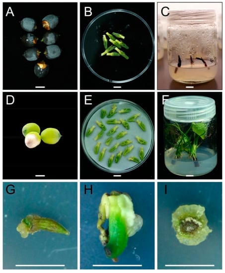 - Liu, Q.; Zhang, D.; Liu, F.; Qin, M.; Tian, D. Micropropagation of Nelumbo nucifera ‘Weishan Hong’ through germfree mature embryos. Vitr. Cell Dev. Biol. Anim. 2019, 55, 305–312. [Google Scholar] [CrossRef]