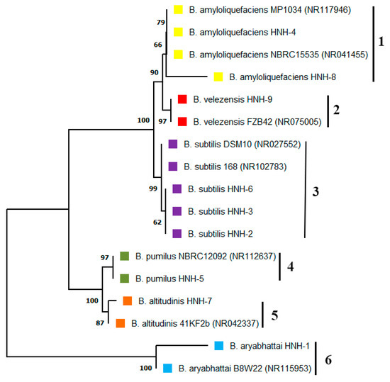 The endophytic bacterial strains isolated from cotton roots were identified through PCR analysis and subsequent 16S rDNA gene sequencing. The results indicated that HNH2, HNH3 and HNH6 had 99.86%, 99.80% and 99.86% resemblance to B. subtilis. The isolates HNH4 and HNH8 showed 99.93% and 99.86% sequence homology to B. amyloliquefaciens. Moreover, HNH1, HNH5, HNH7 and HNH9 were 99.80%, 99.92%, 100% and 100% identical to B. aryabhattai, B. pumilus, B.altitudinis and B. velezensis, respectively. A neighbor joining phylogenetic tree constructed based on the 16S rDNA gene sequence indicated that these bacterial endophytes fall into six different clusters of B. amyloliquefaciens, B. subtilis, B. velezensis, B. pumilis, B. altitudinis and B. aryabhattai (Figure 1). The results indicated that many kinds of Bacillius strains colonized in the roots of upland cotton plants.