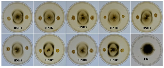 Nine bacterial endophytes isolated from cotton roots were evaluated for their antagonistic activity against VD-080 in a dual culture assay. Results showed that all the isolated endophytic Bacillus strains were able to inhibit the growth of VD-080, but B. altitudinis HNH7 and B. velezensis HNH9 showed the highest inhibition of fungal growth. The diameter of inhibition zones was 10.5 and 9.3 mm for HNH7 and HNH9, respectively (Table 1). The results showed that the nine endophytic Bacillius strains could devour V. dahliae (VD-080), with variable antagonistic effects (Figure 2).