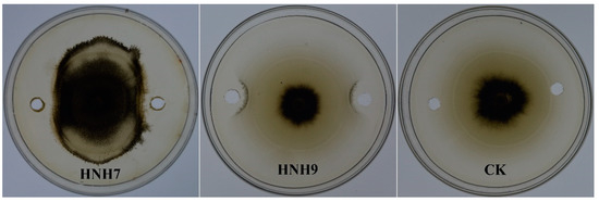 The bacterial strains HNH7 and HNH9 were individually inoculated in Landy medium [50] from an overnight culture of each strain and incubated for 3 days at 30 °C and 180 rpm. Post-incubation, the cultures were centrifuged at 10,000 rpm and 4 °C for 15 min. The cell free supernatants were collected in new tubes and each supernatant was incubated at 4 °C for 12 h after adjusting pH to 2 by adding concentrated HCl. Afterwards, the precipitates were collected through centrifugation and dissolved in 5 mL of HPLC grade methanol [51]. The crude extract of bacterial secondary metabolites (pH 7.0) was passed through 0.22 µm syringe filter to remove impurities and used for the determination of antifungal activity against VD-080. Fungus was grown on PDA for two days and then 10 µL of bacterial crude extract was pipetted in two sides 2.5 cm away from the fungus. In control treatment, methanol was used instead of crude extract.