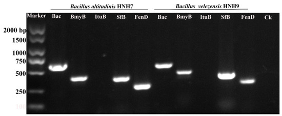 Genetic marker-assisted detection of antimicrobial compounds synthetase genes in HNH7 and HNH9. Bac = Bacillibactin, BmyB = Bacillomycin, ItuB = Iturin, SfB = Surfactin and FenD = Fengycin. Ck = Control.