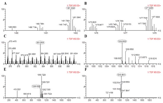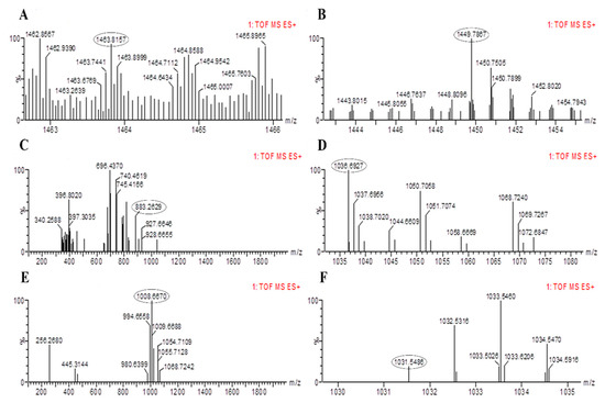 LC-MS chromatogram of methanolic extracts of B. altitudinis HNH7. (A,B) = Fengycin; (C) = Bacillibactin; (D,E)= Surfactin and (F) = Bacillomycin.