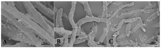 Microbial lipopeptides (LPs) can cause morphological and ultrastructural deformities in fungal hyphae such as pore formation, curling, plasmolysis or removal of cytoplasmic content and breakdown or disintegration of fungal hyphae [19,31,32,33]. Scanning electron microscopy (SEM) analysis has previously supported the hypothesis that the loss of turgidity and structural alterations in the cell wall of fungal hyphae is the core mechanism involved in the antifungal action of LPs [32,33]. In our study, the SEM analysis revealed disruption of V. dahliae (VD-080) hyphae when treated with the LPs of HNH7 and HNH9 compared to control treatment and these morphological changes in the hyphae explain the possible deleterious role of LPs produced by the two endophytes.