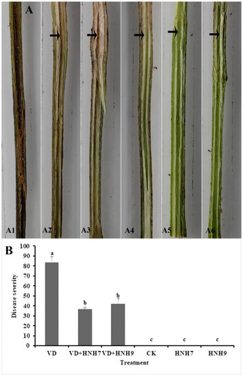 The seeds of susceptible cotton cultivar cv. “Jimian11” were surface disinfected with 1.5% NaOCl solution for 3 min and sown in a mixture of soil containing sterilized peat and vermiculite 1:1 (v/v). The experiment comprised six treatments: (1) VD-080 only, (2) co-inoculated with HNH7 + VD-080, (3) co-inoculated with HNH9 + VD-080, (4) CK (water only), (5) HNH7 only and (6) HNH9 only. Each treatment was replicated 3 times. The plants were treated with 20 mL bacterial cell suspension (OD600 = 2.5) (1 × 108 cfu/mL) at four-leaf stage following the method given by Idris et al. [54]. Furthermore, 24 h after treating the plants with bacterial cell suspension, the roots of plants in respective treatments were inoculated with VD-080 conidial suspension (1 × 107 cfu/mL). Thirty days post-inoculation, the disease severity in plants was recorded following the vascular browning scale given by Bawa et al. [55]. The disease severity index and biocontrol efficacy were calculated by cutting the basal stem vertically and vascular browning was recorded on a 0–4 scale, where 0 = no symptoms or no vascular browning; 1 = 1–25% vascular browning; 2 = 26–50% vascular browning; 3 = 51–75% vascular browning; 4 = more than 75% vascular browning, and calculated using the following formula. Disease severity index (DSI) = [(A × 0) + (B × 1) + (C × 2) + (D × 3) + (E × 4)]/M × 4, where A, B, C, D and E = number of plants with rating scales of 0, 1, 2, 3 and 4, respectively, while M = total number of plants in the treatment observed.