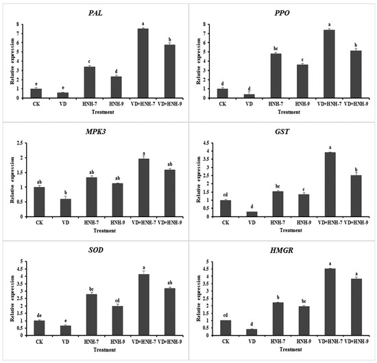 Based on the present study and previous reports, we suggest that the enhanced expression of defense-related genes is responsible for the strong biological control activity of HNH-7 and HNH-9 and plays a vital role in plant defense against Verticillium dahliae.