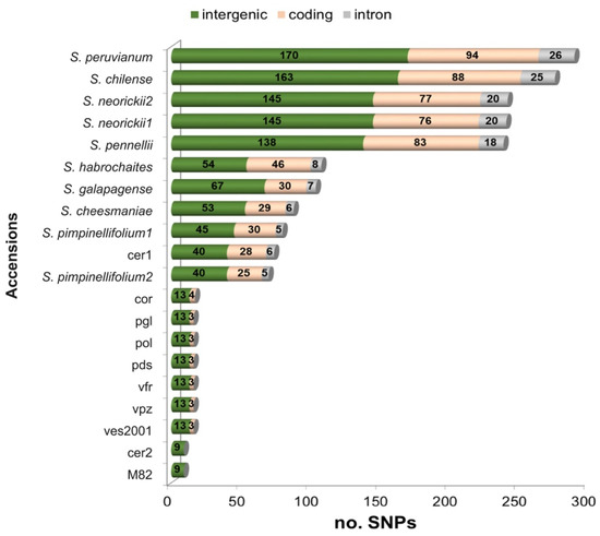 Stacked bar chart showing the distribution of single nucleotide polymorphisms (SNPs) that fall within coding sequences of genes, introns, and intergenic regions of the nine tomato plastomes sequenced in this work and in those of eleven species retrieved from GenBank. The plastome of IPA-6 (AM087200) was used as reference for SNP calling.