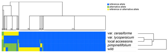 Hierarchical clustered heatmap representing color-coded SNP alleles as scored across 5 different groups of genotypes, i.e., var. cerasiforme; var. lycopersicum; local accessions; pimpinellifolium; wild species (including S. habrochaites, S. cheesmaniae, and S. galapagense). Numbers at the base of the tree indicate the SNP(s) that fall into each group. Blue: reference allele; green: alternative allele; yellow: reference or alternative allele.