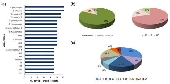 Perfect tandem repeats (TRs) in the nine plastomes sequenced in this work and in the plastome sequence of eleven species available in GenBank. The plastome of IPA-6 (AM087200) was used as reference. (a) Bar chart reporting the total number of TRs in each genotype. (b) Pie charts describing the percentage of TRs located in the coding sequences of genes, introns, and intergenic regions and in the large single copy (LSC), small single copy (SSC), and inverted repeat b (IR) regions. (c) Pie chart describing the percentage of TRs with a specific period size.