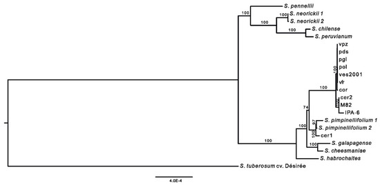 A strict relationship between cultivated tomato varieties and the ancestor S. pimpinellifolium was supported by phylogeny. Species belonging to the Lycopersicon group (S. lycopersicum, S. pimpinellifolium, S. cheesmaniae, and S. galapagense) [49] form a well-supported clade in agreement with previous phylogenetic studies [5].