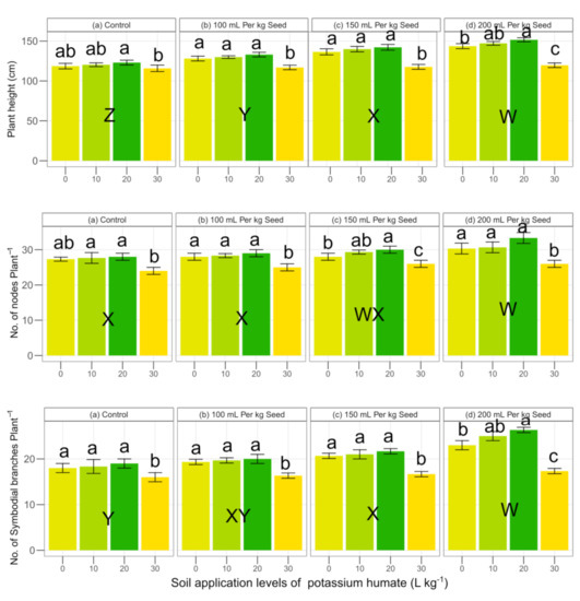 Effect of potassium humate on plant height, number of nodes and sympodial branches of cotton. Within the seed dressing application, the same lowercase letter (s) a, b, or c, indicates that the soil potassium humate application rates are not statistically different at p < 0.05. Among the seed dressings, the same uppercase letter (s) W, X, Y or Z, showed a non-significant effect. Error bars represent the standard deviation of the mean (n = 3, three replications).