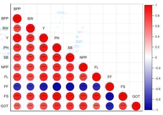 The main interactive effects of soil applied and seed dressed potassium humate were found to be significant at p < 0.05 on the plant height (Table 2). The soil applied potassium humate levels of 20 L ha−1caused a maximum plant height over other levels as well as the overall seed dressing levels of potassium humate, i.e., 0, 100, 150 and 200 mL kg−1 seed. However, all the levels of soil applied potassium humate (10, 20 and 30 L ha−1) depicted more plant height over all the doses of potassium humate applied through seed dressing (Figure 2). However, the soil potassium humate at the rate of 30 L ha−1 showed a lower plant height as compared to 0, 10 and 30 L ha−1) at all seed dressing levels (Figure 2). The main effect of potassium humate soil application and seed dressing was found to be significant at p < 0.05 on nodes per plant (Table 2). However, the interaction effect of soil application × seed dressing was found to be non-significant at p < 0.05 on nodes per plant (Table 2). The soil application of potassium humate at the rate of 20 L ha−1 at seed dressing of level of 0 mL kg−1 showed 2.4, 1.2 and 16.6 % higher nodes per plant as compared to 0, 10 and 30 L ha−1, respectively, while at a seed dressing of 100 mL kg−1, the increase was 3.5, 3.5 and 16.0%, respectively (Figure 2). The maximum increase in potassium humate soil application at the rate of 20 L ha−1 was found at seed dressing of 200 mL kg−1 which was 9.8, 3.5 and 28.1% as compared to 0, 10 and 30 L ha−1. The soil application at the rate of 30 L ha−1 showed 13.8, 12.0, 7.7 and 15.3% lower plant height at the rate of seed dressing levels of 0, 100, 150 and 200 mL kg−1, respectively. The main interaction effects of potassium humate soil and seed dressing application was found to be significant at p < 0.05 (Table 2). The potassium humate soil application at the rate of 30 L ha−1 showed a lower sympodial branches per plant as compared to other levels (0, 10 and 20 L ha−1). However, soil potassium humate at the rate of 20 L ha−1 showed a maximum sympodial branches per plant as compared to 0, 10 and 30 L ha−1 (Figure 2). However, all potassium humate soil application levels showed better results at a seed dressing at the rate of 200 mL kg−1. The plant height, number of nodes and number of sympodial branches showed significant positive pearson correlation with each other (Figure 3).