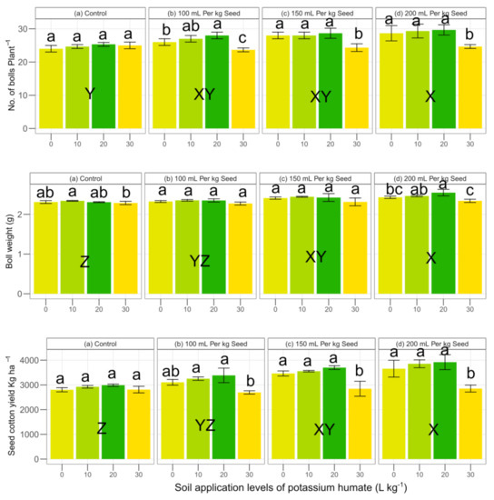 Effect of potassium humate on the number of bolls plant−1, average boll weight and the yield of seed cotton. Within the seed dressing application, the same lowercase letter (s) a, b, or c, indicates that the soil potassium humate application rates are not statistically different from each other at p < 0.05. Among the seed dressings, the same uppercase letter (s) W, X, Y or Z, showed a non-significant effect. Error bars represent the standard deviation of the mean (n = 3, three replications).