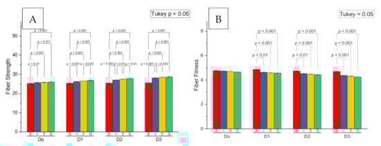 Probability values comparison for the seed dressed (D0 = 0, D1 = 100, D2 = 150 and D3 = 200 mL kg−1) and soil applied potassium humate on the fiber strength (A) and the fiber fitness (B) of cotton.