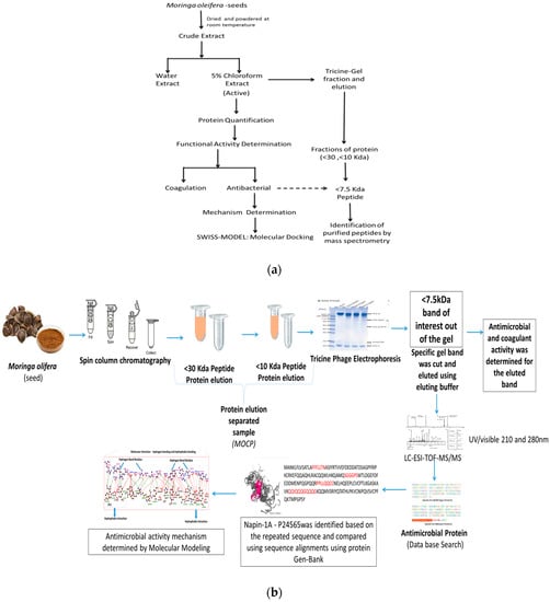 (a) Bioactivity-guided isolation of the antimicrobial compounds from Moringa seeds. (b) Outline on identification and purification of bioactive peptide from Moringa seeds.
