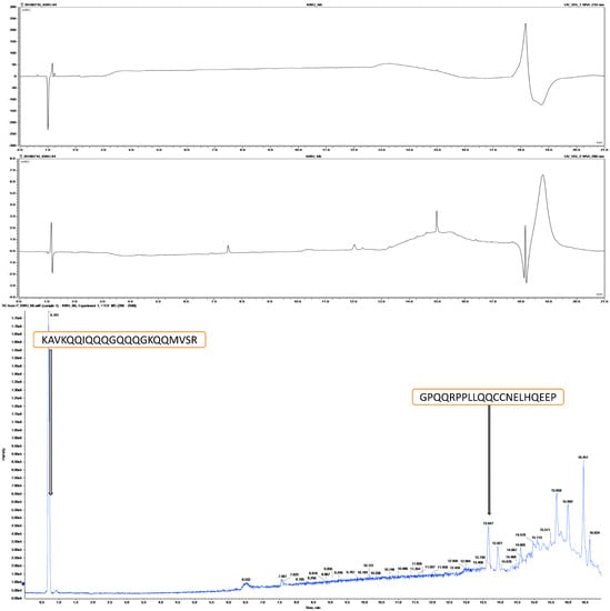 The specific < 7.5 kDa peptide band from the Tricine-gel was eluted using elution buffer (0.1–0.5% SDS or acid labile surfactants) to the tube (20 μL/piece of gel); further, the eluted bands from <7.5 kDa peptides were identified in the low molecular weight peptide profile, and plant protein profiling is displayed in Figure 3. A total of 2173 peptides were notorious and eluted, and further tested in vitro for antimicrobial activity; the peptide sequences were screened using an in silico platform for pediocin protein and peptide profiling, and developed QS 3.0 software (Applied Biosystems, Seoul, Korea) was used to predict potential antimicrobial peptides (AMP). Although many potential antimicrobial inhibitory peptides were identified, peptides FFFLLTN, SGGGPS, PPLLQQCCNEL, KAVKQQIQQQGQQQGKQQMVSR, and GPQQRPPLLQQCCNELHQEEP (Figure 4) (Supplementary Table S1) were most abundant, which showed the strongest antimicrobial activity (0.207 µg) of <7.5 kDa fraction [,,]. As Moringa coagulant protein has been reported as a complement to the chemicals in drinking water treatment process, the present study reveals that the antimicrobial property of Moringa extract provides a good substitute to treat water, thereby reducing the risk of infection caused by water contamination.