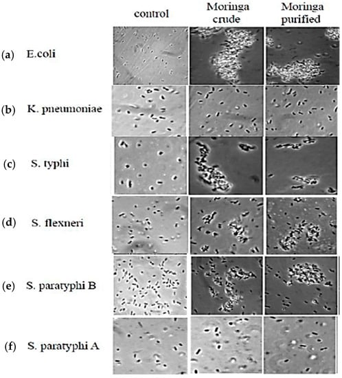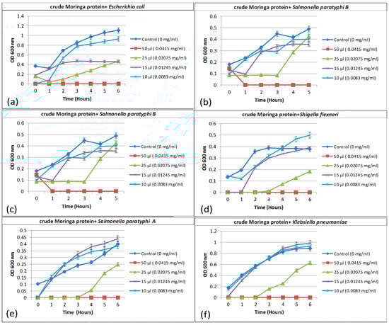 The growth kinetics experiments were performed on all six clinical isolates with CE and CP from Moringa seed (Figure 7). The crude extract (CE) of Moringa seed showed growth inhibition up to 6 h against Escherichia coli 0157:H7, Salmonella paratyphi B, Salmonella typhimurium, Shigella flexneri, Salmonella paratyphi A, and Kelbsiella pneumoniae. The concentration of CE ranging between 0.041–0.008 mg/mL is required for the complete inhibition of growth. Among the isolates tested, Salmonella typhimurium affected by 0.02 mg/mL of MC was effective, and showed growth inhibition up to 3 h; thereafter, it started to grow slowly. On the other hand, the optical density was lower, compared to that of the control. The reduced growth rate mentioned in Figure 4 refers to inhibition of the growth up to 3 h. Broin [] reported that the minimal inhibitory concentration (MIC) for E. coli was 50 mg/mL up to 150 min. In this study, the CE of Moringa seed showed growth inhibition at low concentration of 0.008 mg/mL up to 6 h, proving the efficiency of the proteins present in the CE. The possible reason could be the extraction method used to get soluble proteins from the crude extract and/or the variety of the seed used in this study and the efficiency of coagulant protein. This is very well in correlation with earlier reports that stated that when drinking water is treated with crude seed extract of Moringa and stored for a longer time, it will change taste and odor, due to organic load and disinfection byproducts [,]. Therefore, it is essential to separate the coagulant protein from the crude extract, and test for antibacterial activity and water treatment.