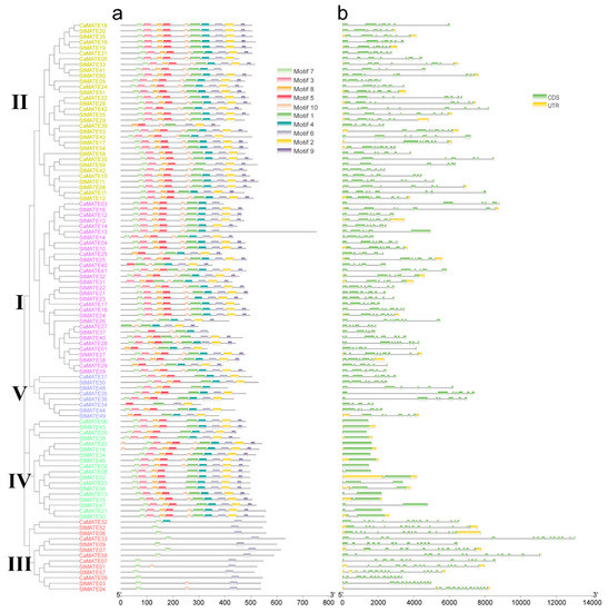 Conserved motifs in pepper and potato MATE proteins and their associated MATE gene structures. Left: phylogenetic tree of 42 CaMATE and 60 StMATE proteins replotted from Figure 1. (a) Conserved motifs of pepper and potato MATE proteins. Each colored box represents a protein motif identified by multiple EM for motif elicitation (MEME), and the box is placed at the appropriate position within the protein. MATE proteins are ordered according to the phylogenetic tree. (b) MATE gene structures in pepper and potato.