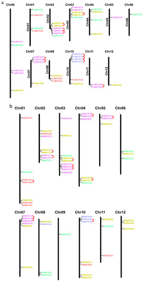 To explore the relationship between pepper and potato MATE genes, we determined their chromosomal locations and whether they originated from gene duplication events. MATE loci were unevenly distributed in the pepper and potato genomes. We identified pepper CaMATE genes on all chromosomes, except chromosome 09. Several pepper chromosomes had four to six CaMATE genes (chromosomes 00, 01, 02, 03, 04, 07, and 10), while other chromosomes had one to three CaMATE genes (chromosomes 05, 06, 07, 11, and 12) (Figure 3a). In addition, we observed clusters of CaMATE genes on chromosomes 02, 07, and 10 (Figure 3a). Similarly, potato StMATE genes mapped to all 12 potato chromosomes, with six to nine StMATE genes on chromosomes 01, 02, 03, 04, 07, and 10 (Figure 3b).
