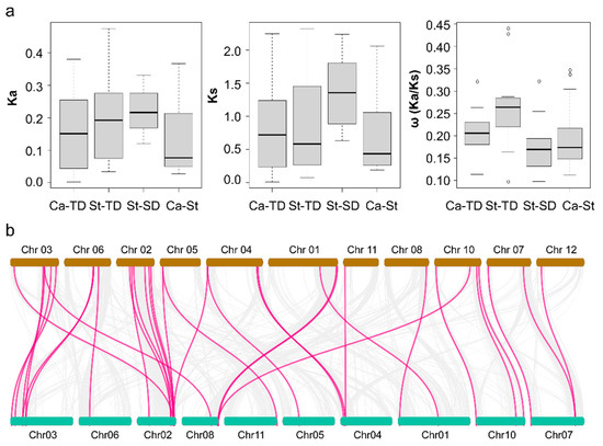 Collinearity analysis of MATE genes between pepper and potato. (a) Average value of Ka, Ks, and ω (Ka/Ks ratio). The x-axis indicates tandem duplication (TD) events in pepper (Ca) and potato (St), segmental duplication (SD) events in potato, and collinear pairs between pepper and potato (Ca-St). The y-axis shows Ka, Ks and Ka/Ks ratios of MATE genes for each pair. Boxplots were generated in R. (b) The potato chromosomes are in brown (top) and pepper chromosomes in green (bottom). Putative orthologous genes in their genomes are connected by lines and were identified using MCScanX. The innermost grey solid lines show collinear relationships between MATE genes. We identified 30 orthologous MATE gene pairs, indicated by magenta lines.