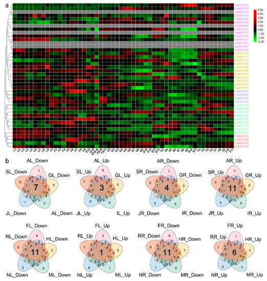 Expression of pepper CaMATE genes during plant development and in response to various stresses. (a) Tissue-specific expression data for pepper CaMATE genes were obtained from published data (http://www.hnivr.org/pepperhub). Red and green colors represent higher and lower expression, respectively. Pepper samples: L: leaf, F: flower, P: petal, O: ovary, STA: anther, FST: whole fruit, G: pericarp, T: placenta, ST: placenta, and seed, S: seed. Heat map of the expression data for MATE genes in the selected 54 pepper tissues. The heat map with phylogenetic tree was drawn with R. (b) Venn diagrams of CaMATE expression in response to phytohormones and stress. A: ABA-treated; S: SA-treated; J: JA-treated; I: IAA-treated; G: GA-treated; F: freezing-treated; R: H2O2-treated; N: NaCl-treated; M: mannitol-treated; H: heat-treated; Up: up-regulated genes; Down: down-regulated genes. L: leaves; R: roots. The two-letter code lists the treatment first, then the tissue. The numbers given in the Venn diagram represent the numbers of up-/down-regulated genes.