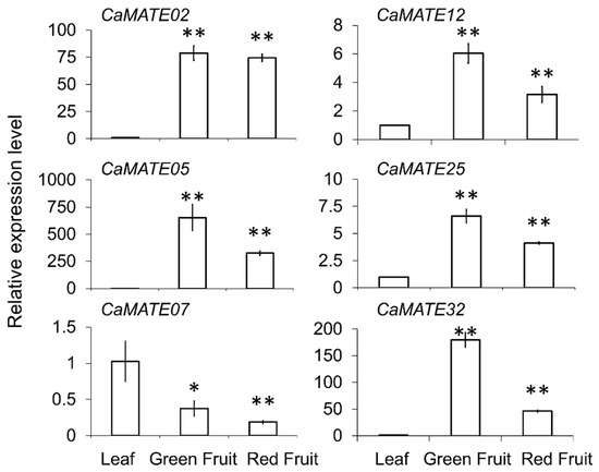 Expression of CaMATE genes during development. Quantitative reverse transcription PCR (qRT-PCR) analysis of six CaMATE genes in leaf and fruit tissues. CaMATE transcript levels were normalized using CaUBI-3 as the internal reference. Each data point represents the average of three biological repeats. * p < 0.05; ** p < 0.01 by Student’s t-test.