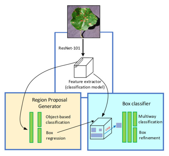 To address the task of object identification, the classification and localization of objects are performed in a single platform by using deep learning meta-architectures. In this regard, few DL algorithms have been developed. The Region-based Convolution Neural Network (RCNN) was among the first modern techniques towards image detection tasks through CNN [23]. Afterward, the successful implementation of regional proposal methods proved significant developments in object identification. In the context of plant disease recognition, very few studies have been conducted to perform this complex agricultural operation by DL techniques. For example, in [24], the deep learning models were implemented to perform plant disease localization and diagnosis. The authors used their own annotated images of tomato leaf and successfully obtained a higher mean average precision. In [25], two different approaches were developed and compared to perform automated pest detection based on ML/DL learning strategies. This work focused on the detection of the harmful pest in greenhouse tomato and pepper crops. Their findings showed that the deep learning methods provided a better result as compared to the machine learning algorithms due to its capability to perform detection and classification tasks in one step. A recent article presented the DL approach to diagnose disease in Cassava leaves by using the Single Shot MultiBox Detector (SSD) and achieved satisfactory results [26]. Another recent research considered the plant disease recognition task by CNN to estimate the severity of defects in the plant leaves [27].