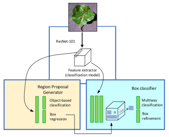 In Faster RCNN architecture, the object detection task performs at two different stages as compared to SSD. At the region proposal network (RPN) stage, the images are processed to generate region proposals directly through feature extractors (Inception and ResNet) instead of an external algorithm such as Edge Boxes. These features are used to forecast class-specific proposals for each intermediate convolutional layer. Then, the generated anchor boxes are used at the second step of detecting the characteristics of the same immediate layer of an image. Figure 5 presents the basic concept of the Faster RCNN model, and the overall loss is evaluated by Equation (2) [33]: