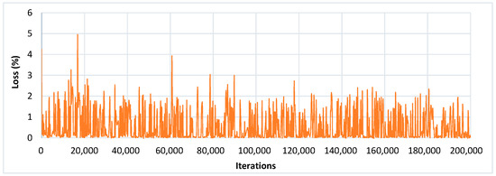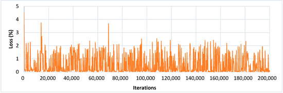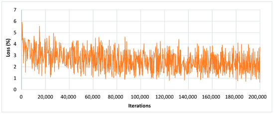 Using the ResNet-101 as the feature extractor, the RFCN model achieved good detection results of 83.6% mAP on the PASCAL VOC dataset. Therefore, the same feature extractor with the baseline model (RFCN) was also considered in this research. In this DL method, all learnable weight layers are convolutional, which computes the feature map on the entire image. The R-FCN model was fine-tuned and trained with the momentum optimizer using the learning rate 3 × 10-4 for 90k steps, and then continued training for the next 30k steps with 3 × 10-5, and finally, 80k steps with 3 × 10− 6. This model completed 200k iterations in 33.7 h. The training loss obtained by the RFCN model is presented in Figure 13, and its percentage loss oscillated from 0.03% to 1.28% after 200k iterations.