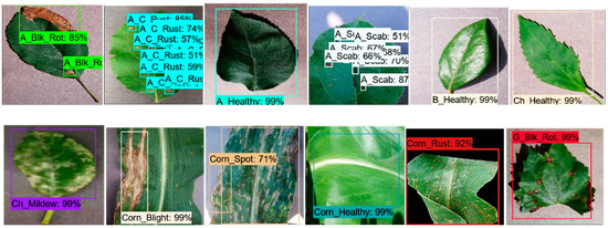 This model identified a lesser number of classes than the SSD and Faster RCNN (with ResNet-101) models; the failed classes were: corn healthy, grape healthy, peach healthy, potato healthy, tomato Septoria, tomato early blight, and tomato late blight (as shown in Table 4). The strawberry scorch class achieved the perfect average precision of 100%. It is also observed that 9 plant classes provided good detection results and achieved considerable precision (more than 90%). Around 11 other classes showed an average precision of less than 10%. Few examples of the false/confused detection results by the RFCN model are shown in Figure 14.