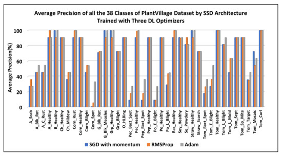 - Figure 15 presents the change in AP for each class of the PlantVillage dataset when they were trained by the SSD model with all the three DL optimizers.