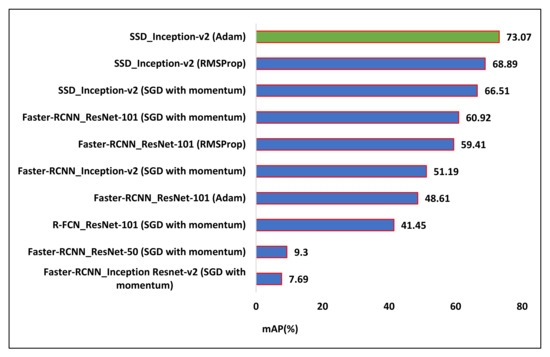 Figure 16. Summary of mean average precision (%) achieved by the DL meta-architectures with their respective optimizers (the best combination of DL meta-architecture and optimizer is shown by green bar).