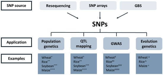 Applications of single nucleotide polymorphisms (SNPs) in plant sciences. Citations are as follows: * [47,48], ** [49], *** [50,51], **** [52,53,54], † [55,56,57], †† [58,59,60], ††† [50,61], †††† [62,63,64], ‡ [65,66], ‡‡ [67,68,69], ‡‡‡ [70,71], ‡‡‡‡ [62,72], a [73,74,75], b [76,77], c [78,79].