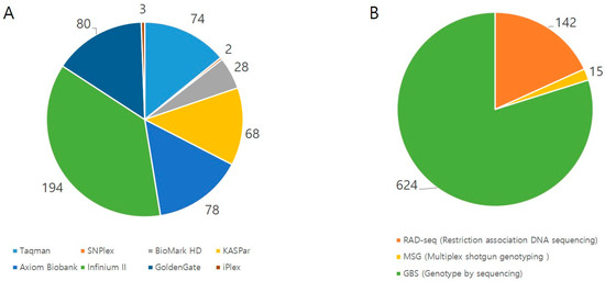 Publication search results (the NCBI’s PubMed database, www.pubmed.gov) from 2011 to present using different SNP genotyping methods in plant sciences. (A). Array- or PCR-based genotyping platforms. (B). Next generation sequencing- (NGS)-based genotyping platforms.
