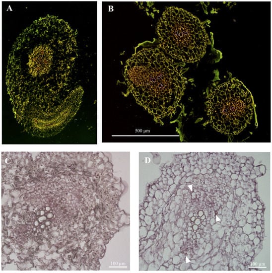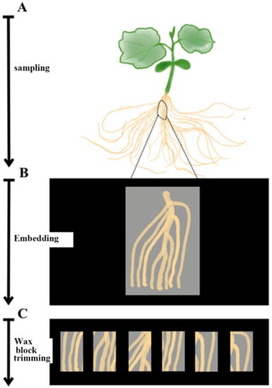 Cucumber seedlings were sampled on ice. Due to the less lignification in stems of cucumber seedlings, the small and softened part of roots, the stem with a length of 3–4 cm and the root segments containing lateral roots were cut into smaller pieces for tissue sampling before section (Figure 3).