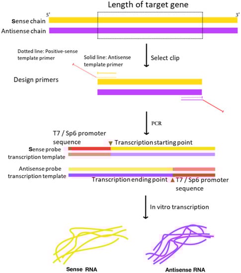 Schematic of the optimized RNA probe with target gene preparation and generation. The transcriptional probe is consisting of two parts: RT-PCR fragment and T7/SP6 promoter sequence. The sense probe and the antisense probe are ligated in opposite directions to the promoter. The sense probe is the negative control of the target gene, and the antisense probe is the complementary sequence of the target gene. According to the mRNA sequence length of the target gene, the sequence of the target gene initiated from GG and with a GC content of 40–70% was selected as a template fragment. The length of template fragment is better in the rage of 500–1500 bp. The dotted line indicated primers for sense probe and the solid line indicated primers for antisense probe.