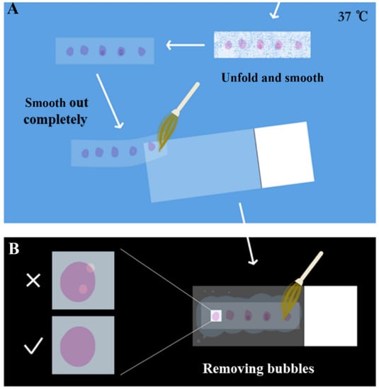 Schematic tips of the optimized process of unfolding and smoothing sections. (A) The sections softened and smoothed out with paraffin completely, until the color changed from white to almost transparent. Then, the section was smoothed out again gently with a brush on the slide. (B) Pressed lightly with the brush to drive off the air bubbles, and then absorbent paper was used to gently absorb the water to reduce the drying time and improve the effect of drying, avoiding the separation of the sample from the slide later.