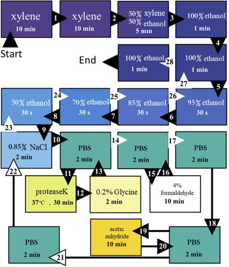 The reagents required for this stage are all made up of RNase-free water. In addition to the commonly used reagents xylene, gradient ethanol (100–95–85–70–50%), 0.85% NaCl, ethylene diamine tetraacetic acid (EDTA), and phosphate-buffered saline (PBS) buffer, before the start of the experiment and according to the requirements of the experiment, proteinase K solution, 0.2% glycine solution, 4% formaldehyde solution, acetic anhydride solution, and other related solutions were prepared. Their formulas are as follows.