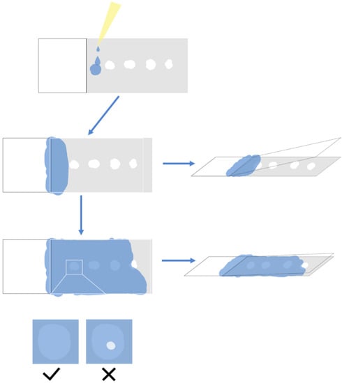 Schematic of the key technical points in the sealing of optimized hybridization incubation. The RNA hybridization liquid drops on the position shown with blue color, and then gently pressing down one side of the cover glass on this side and press it with the left hand to make the cover glass fit the RNA hybridization liquid. Hold the cover glass with the right hand and slowly put down the other layer. The RNA hybridization liquid is pushed away slowly with the cover glass. The moving speed of the cover glass must be slower than that of the RNA hybridization liquid, especially the viscous anti RNA hybridization liquid with glucosamine sulfate.