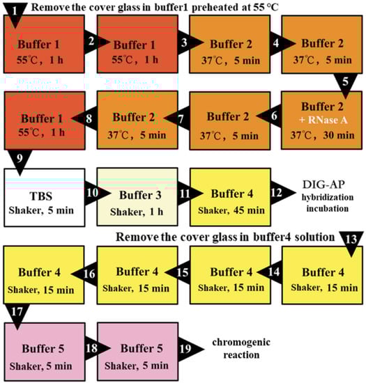 In addition to the commonly used reagents, this stage of the experiment required the purchase of 10× tris-buffered saline (TBS) buffer, RNase A, bovine serum albumin (BSA), skimmed milk powder (Roche, Shanghai, China), Triton X-100 (Sigma, Shanghai, China), DIG-AP (Roche, Shanghai, China), and Chromogenic substrate NBT/BCIP (Roche, Shanghai, China). Before starting the experiment, five buffers, Buffer 1 (0.2× SSC), Buffer 2, Buffer 3, Buffer 4, Buffer 5, and two reaction solutions, AP antibody solution and NBT/BCIP solution showing substrate, were created. The solutions at this stage can be prepared by ordinary distilled water, and their formulas are as follows: