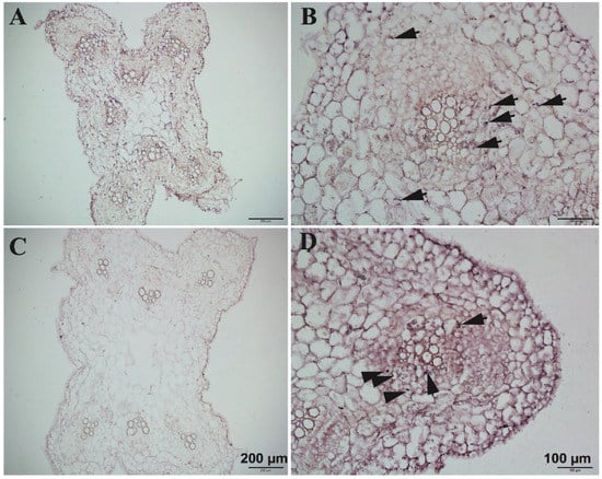 In the experiment, we used CsNPF7.2 to study the optimization of RNA in situ hybridization. The function of CsNPF7.2 is related to nitrogen stress. Under nitrogen deficiency, the expression of CsNPF7.2 is up-regulated, which could promote the growth of xylem in cucumber root []. We observed the results of in situ hybridization (Figure 8) of CsNPF7.2, which was highly expressed in vascular cambium and parenchymal cells around the xylem of cucumber root.