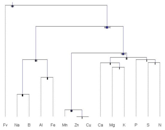 36]. The significance of the partition was assessed by a chi-square test against equal distribution. The TN specimens were the reference subpopulation (high yield of nutritionally balanced specimens). The FN specimens presented yield limitations due to factors other than mineral nutrition. The TP specimens showed nutrient imbalance, leading to low yield. The FP specimens represented high yielders subject to luxury nutrient consumption or contamination.