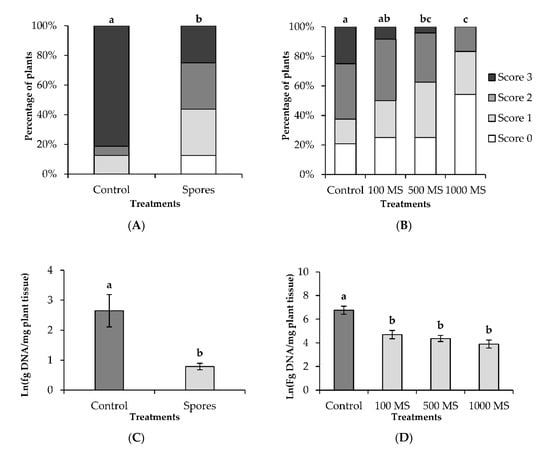 Biocontrol of Verticillium wilt in cauliflower in greenhouse conditions when V. isaacii Vt305 was applied as spores or as microsclerotia (MS). (A) Vascular discoloration 70 days post transplantation (dpt) to naturally infested soil of cauliflower plants inoculated with V. isaacii Vt305 via root dip in a spore suspension with a concentration of 106 spores mL−1 or mock-inoculated via root dip in sterile water in case of the control; (B) Vascular discoloration 103 dpt to naturally infested soil of cauliflower plants inoculated with V. isaacii Vt305 via seed treatment with a microsclerotia suspension applied in different concentrations (100, 500, or 1000 microsclerotia plant−1) or mock-inoculated via seed treatment with sterile water in case of the control. Results on vascular discoloration are shown as percentage of plants (n = 12) with a specific score for vascular discoloration: 0 = no vascular discoloration; 1 = vascular discoloration of <50% of stem length; 2 = vascular discoloration of 50–75% of stem length; and 3 = vascular discoloration of 76–100% of stem length. (C) Amount of detected V. longisporum DNA in the hypocotyl 28 dpt when V. isaacii Vt305 was applied as spores; (D) Amount of detected V. longisporum DNA in the hypocotyl 103 dpt when V. isaacii Vt305 was applied as microsclerotia. Values are means ± standard error (n = 6). Colonization data were ln transformed before statistics. Bars indicated with the same letter are not significantly different according to a Mann–Whitney U-test in case of the vascular discoloration and according to a Tukey test in case of the colonization data (p < 0.05).