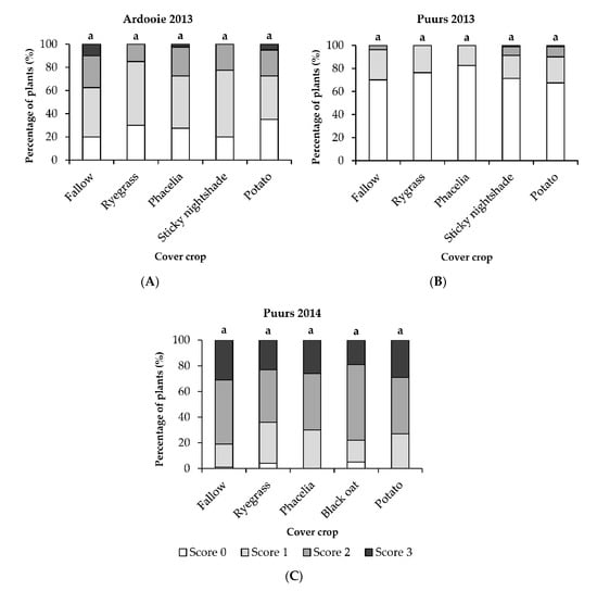 Verticillium wilt of cauliflower in grower’s fields located in Ardooie and Puurs during the growing seasons of 2013 and 2014 in five cover crop systems. (A) Vascular discoloration of the cauliflower stems in the field at Ardooie in 2013; (B) Vascular discoloration of the cauliflower stems in the field at Puurs in 2013; (C) Vascular discoloration of the cauliflower stems in the field at Puurs in 2014. Data are shown as the percentage of plants (n = 20) with a specific score for vascular discoloration at harvest of the cauliflower curds: 0 = no vascular discoloration; 1 = vascular discoloration of <50% of stem length; 2 = vascular discoloration of 50–75% of stem length; and 3 = vascular discoloration of 76–100% of stem length. Bars indicated with the same letter are not significantly different according to a Mann–Whitney U-test (p < 0.05).