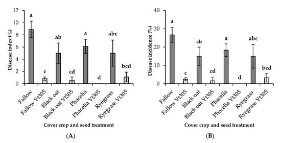 The effect of combining green manure crops and seed treatment of cauliflower with V. isaacii Vt305 on Verticillium wilt was tested during a field experiment in a grower’s field located in Puurs. A dose of 500 microsclerotia per seed was used to treat the cauliflower seeds. At harvest of the cauliflower curds, vascular discoloration of the stems was evaluated. The percentage of affected plants and the disease index (disease severity) are shown in Figure 3. The cultivation of black oat, Phacelia, or ryegrass alone did not significantly reduce Verticillium wilt compared to the fallow plots. Pre-inoculation of the cauliflower plants with V. isaacii Vt305, however, resulted in a significant reduction of the disease severity and incidence in all four cover crop systems. The combination of Phacelia and seed treatment with V. isaacii Vt305 of cauliflower resulted in the best protection against Verticillium wilt as no vascular discoloration was observed in the evaluated cauliflower stems. The artificial inoculation with V. isaacii Vt305 was clearly the determining factor in the reduction of Verticillium wilt. The soil of the different plots was also sampled to determine the inoculum densities of V. isaacii, V. longisporum, and V. dahliae at different time points (Figure A3). In this way, we could determine if differences in Verticillium disease were the result of changes in the ratio between soil populations of V. isaacii and V. longisporum. However, the results of the soil analyses did not correlate with the observed disease pressure of V. longisporum in the different plots. The high variability in disease pressure between the different plots could not be linked to differences in the soil populations of V. isaacii and V. longisporum.