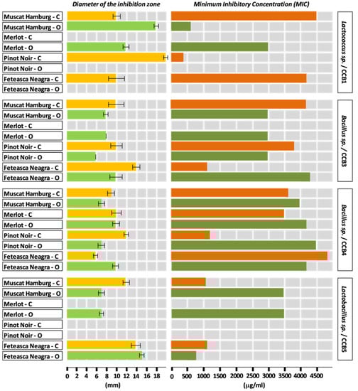 Thus, regardless of the anatomical part of the grapes, the 16 extracts showed antibacterial activity against the CCB4 strain and with only the Merlot variety cultivated in a conventional vineyard against the CCB3 strain as an exception. The antibacterial activity of all extracts was null relative to the CCB11 strain.